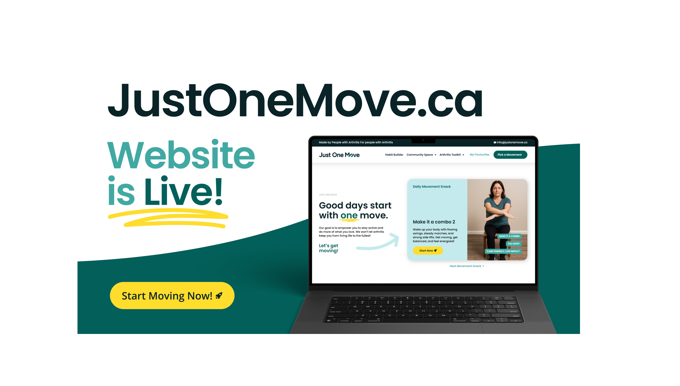 - JustOneMove.ca, a website that empowers people with inflammatory arthritis to get active and live life to the fullest. It was created by people who have a solid understanding of the condition, including physical activity experts, researchers (including my team and I), rheumatologists, physiotherapists and people with inflammatory arthritis. JustOneMove.ca has tons of useful resources, including an arthritis toolkit with tips and FAQ responses from experts, a movement vault with safe, arthritis-friendly activities that you can filter by type, body area, joints used, time, equipment and more to help you find exactly what you’re looking for, a community space where people with inflammatory arthritis share inspiring stories about their successes and challenges with physical activity, and more!”