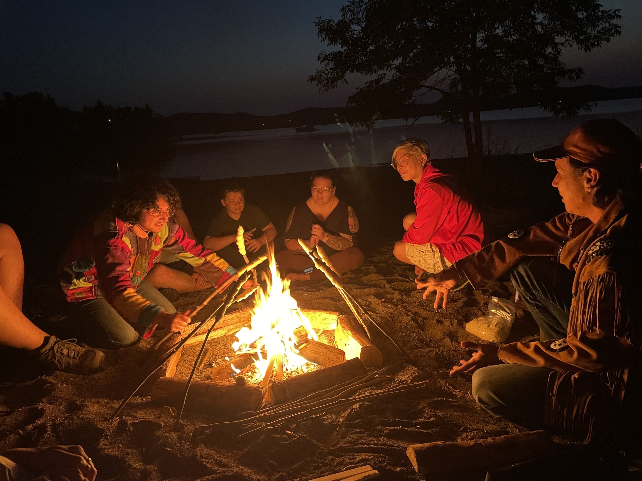 A group of people roasting luskinikn over a beach bonfire after a sunset kayak.