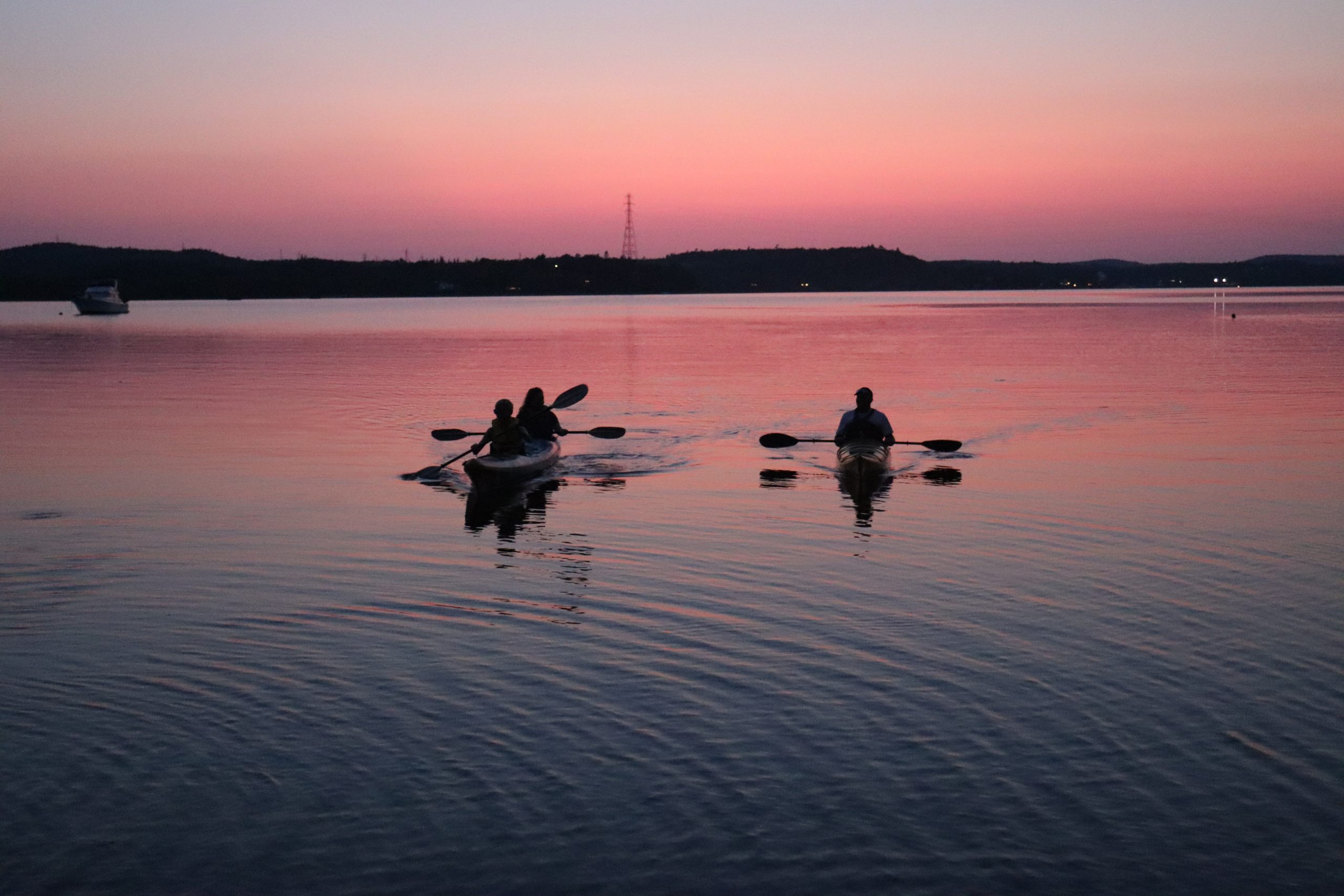 A group of people kayaking on the Wolastoq/Saint John River at sunset.