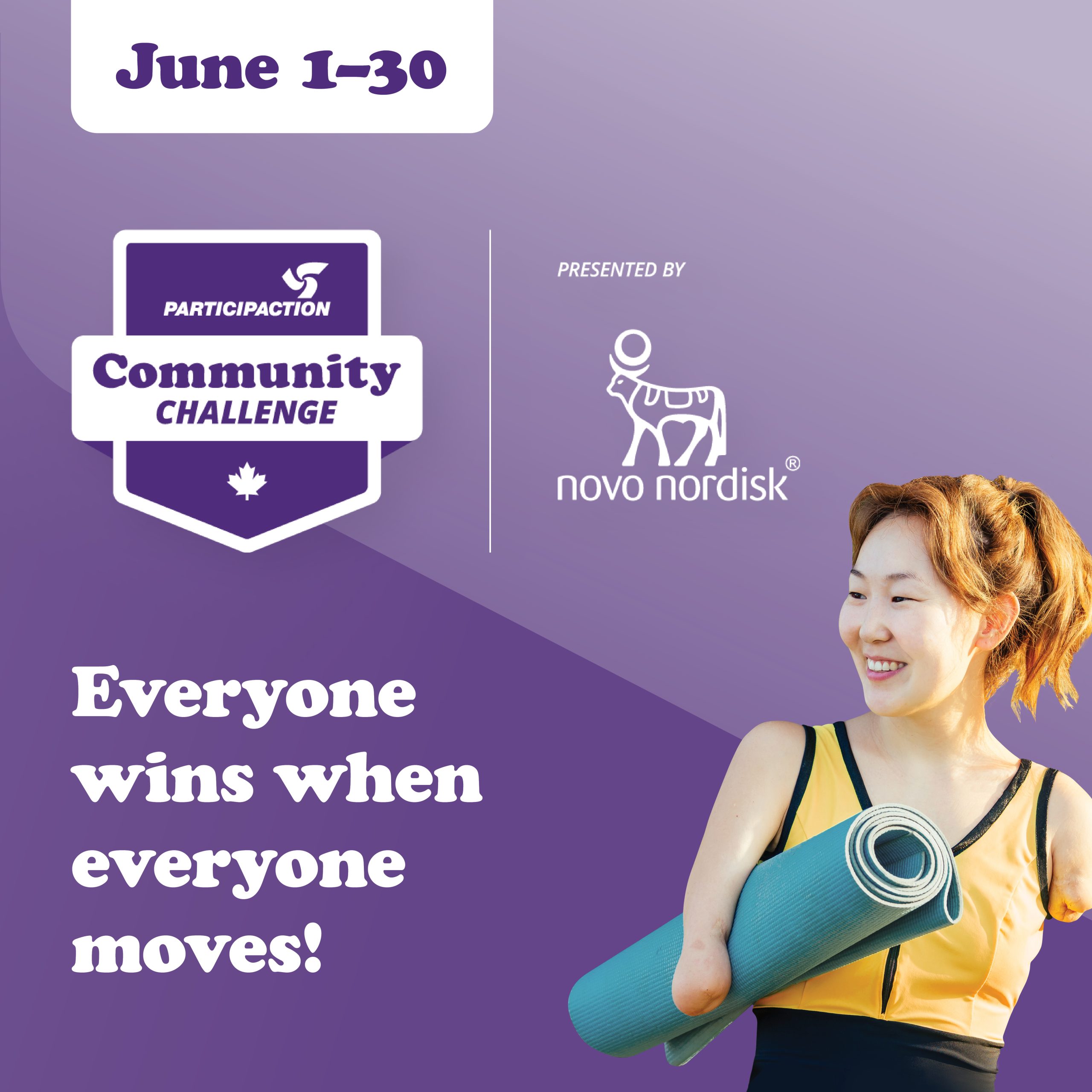 Looking for a fun way to get moving, connect with others and help your community get crowned Canada’s Most Active? The ParticipACTION Community Challenge presented by Novo Nordisk is on until June 30! Sign up on the Community Challenge webpage and commit to being active throughout the month to help your community compete for the title of Canada’s Most Active and win $100,000 for local sport and physical activity initiatives. Plus, the most active community in each remaining province and territory will receive $7,500 to $15,000. Join today!