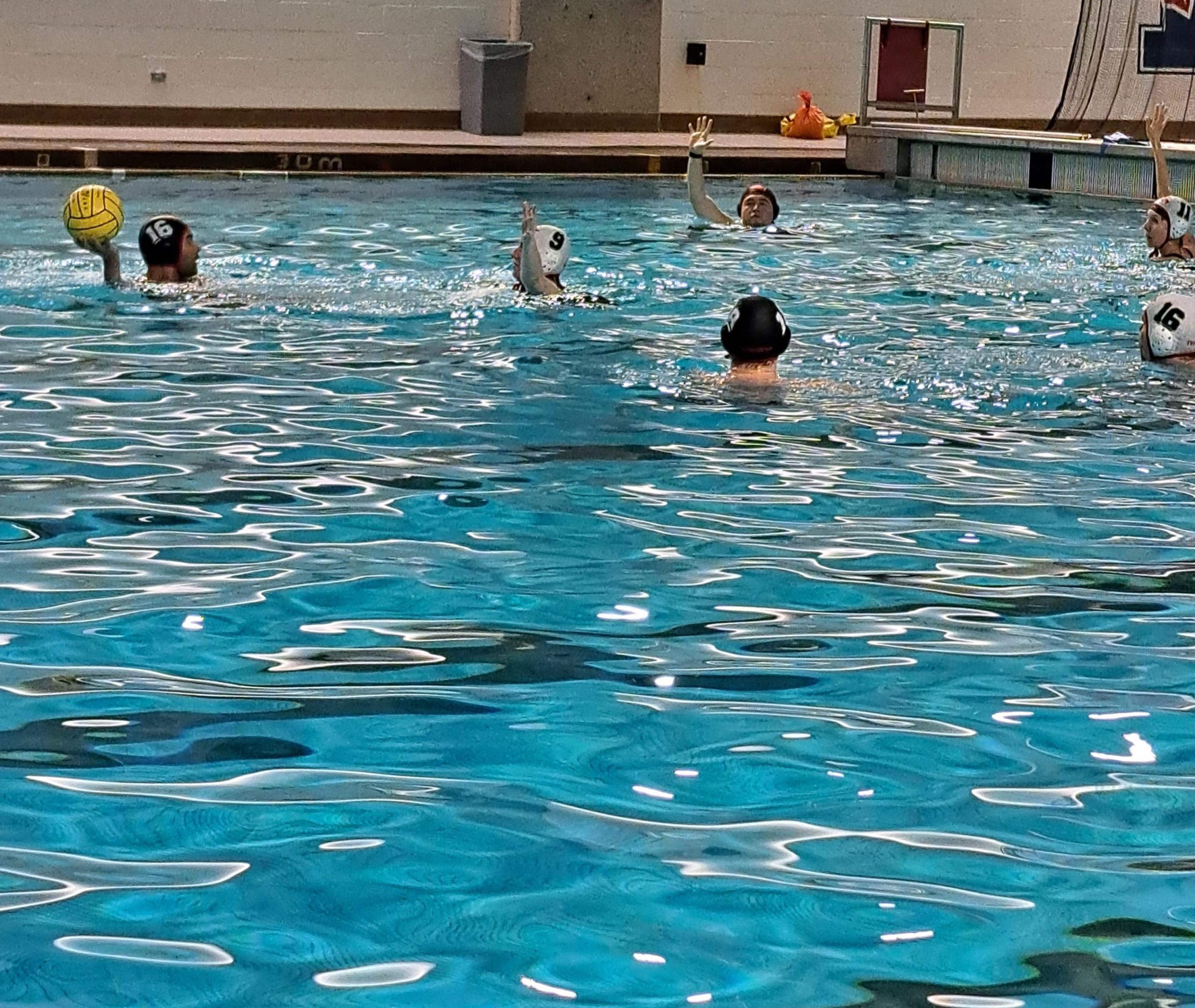 A group of people playing water polo in an indoor pool.