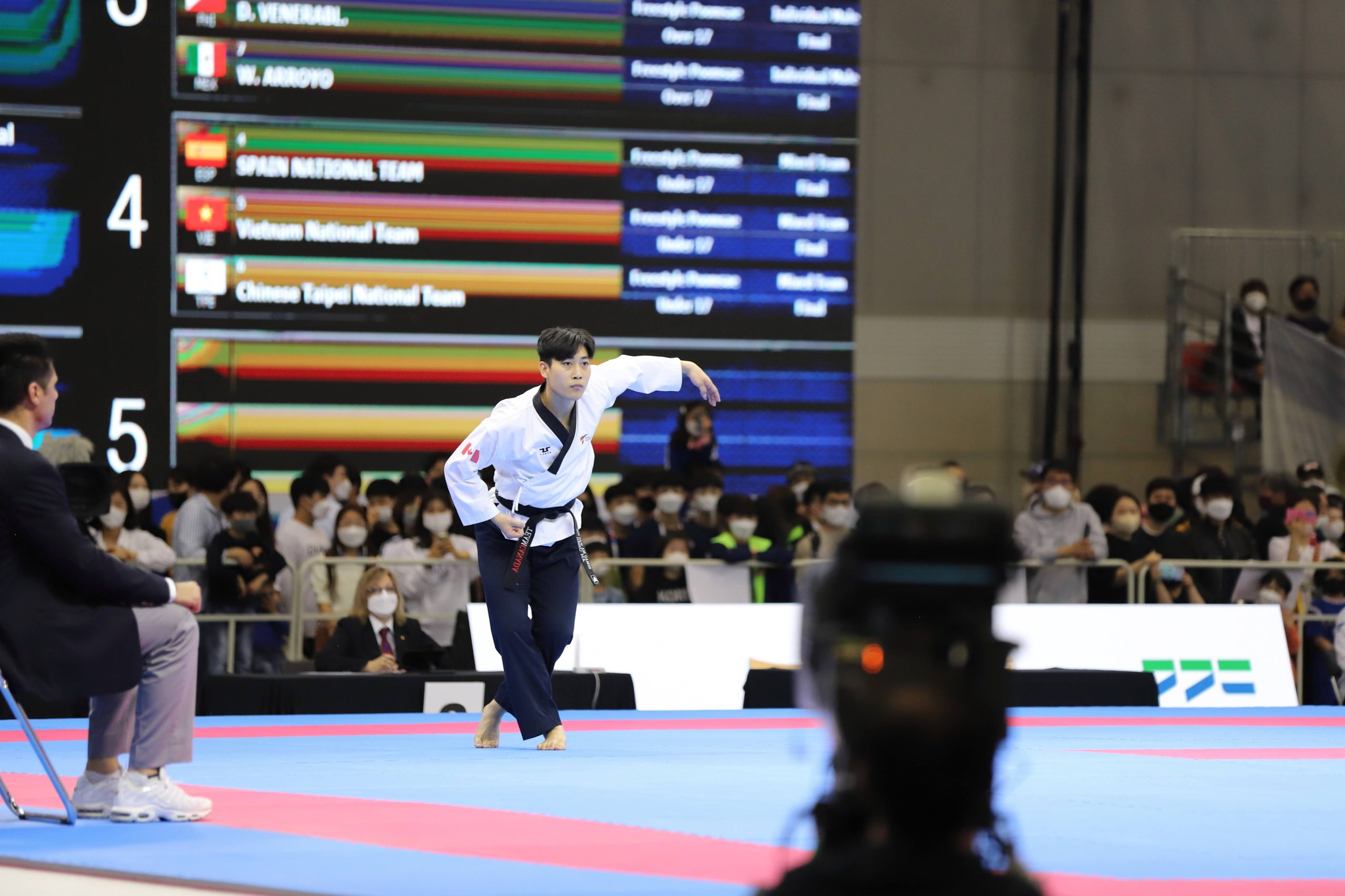 Vêtus d’uniformes blancs traditionnels appelés doboks, les athlètes s’affrontent en trois rounds de deux minutes chacun sur un ring de huit mètres sur huit. Ils marquent des points en exécutant divers coups de pied et de poing sur le plastron recouvrant la poitrine ou la tête de leur adversaire :