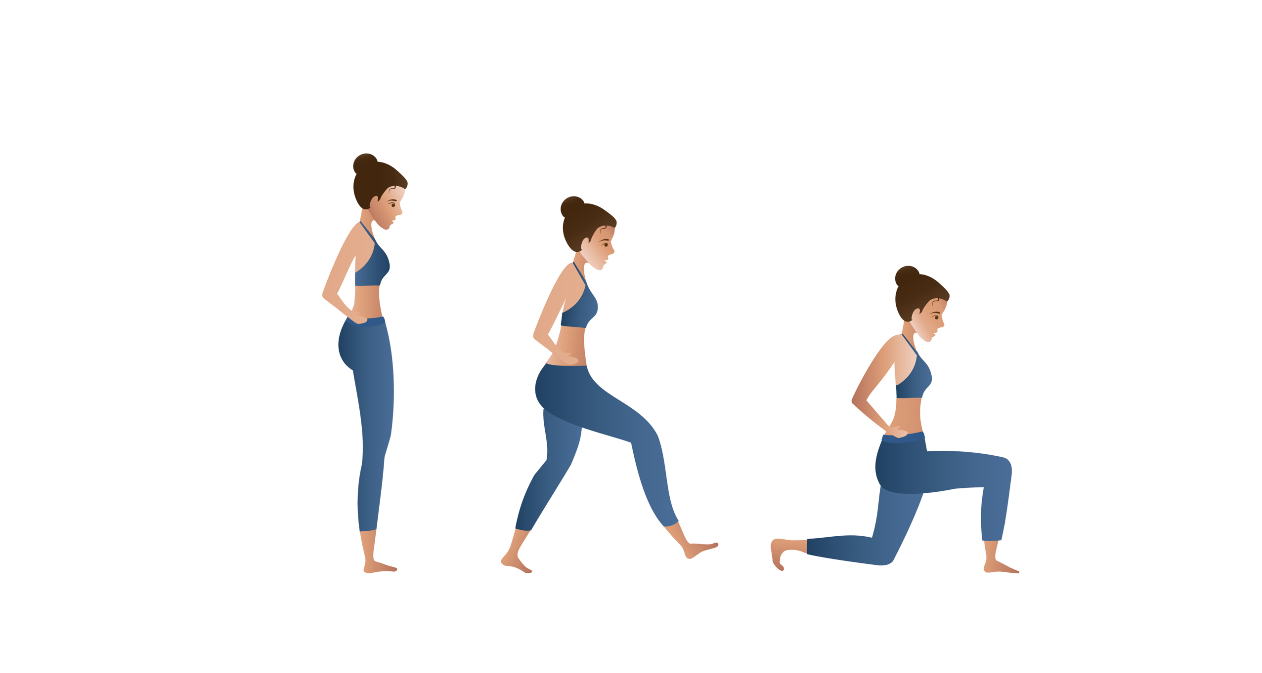 En position debout, les pieds écartés, en ligne avec les hanches, faites un pas vers l’avant avec le pied droit, puis pliez lentement les deux genoux jusqu’à ce que le genou arrière soit à quelques centimètres du sol.