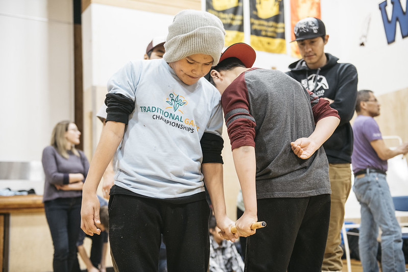Durant le printemps, lorsque les rivières se remettaient à couler, les Dénés se servaient des trous dans la glace créés par le courant pour pêcher à mains nues. L’hiver venu, ces peuples jouaient à la traction du bâton à l’intérieur ou à l’extérieur pour améliorer leur force de préhension, leur force globale et leur technique de traction, des habiletés nécessaires pour bien agripper les poissons glissants et les sortir de l’eau. Une bonne technique permettait de bien tenir le poisson sans toutefois le serrer si fort qu’il s’échappe.