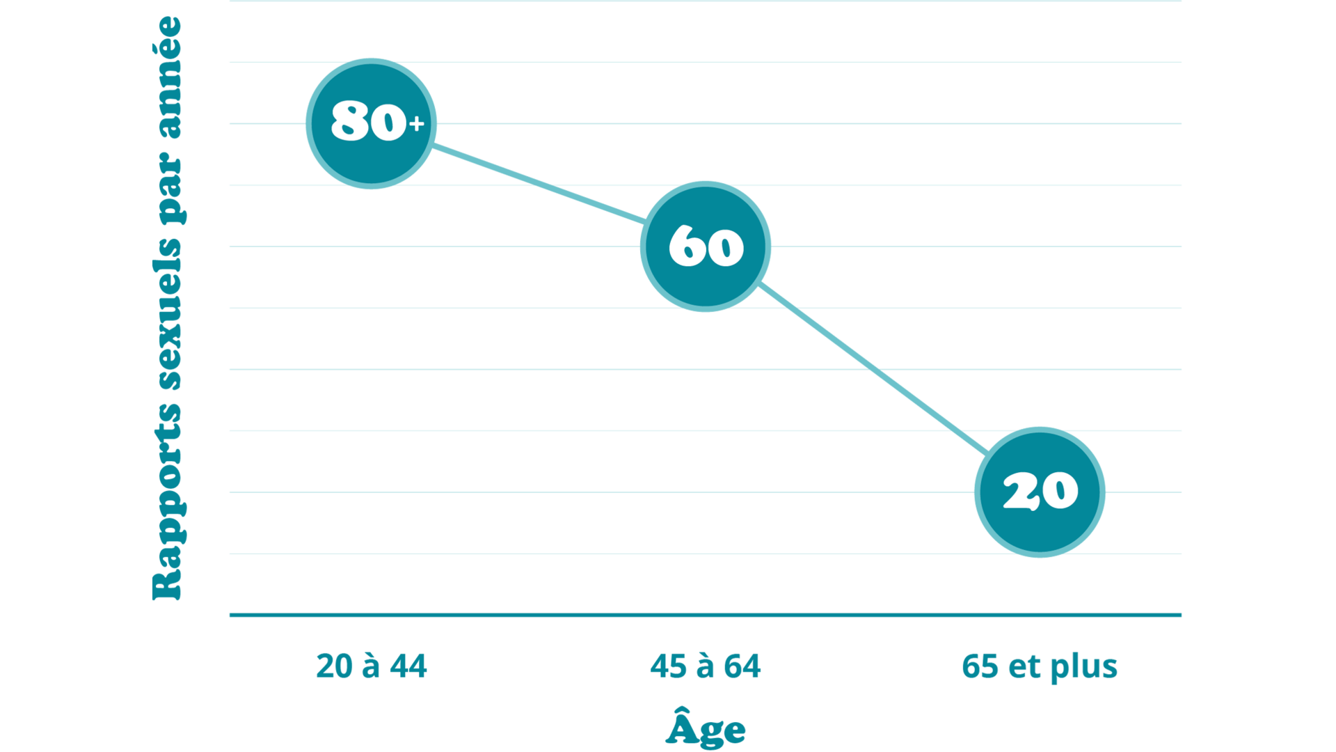 Les jeunes dans la vingtaine ont en moyenne plus de 80 rapports sexuels par année, mais ce chiffre diminue à 60 fois par année à 45 ans et à 20 fois par année à 65 ans.1