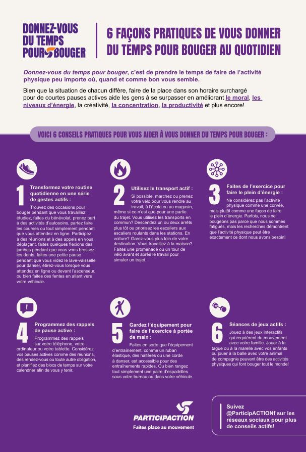 Donnez-vous du temps pour bouger encourage les gens à intégrer de petites périodes d’activité physique où, quand et comme cela leur convient le mieux. Même si chaque situation de vie est différente, prévoir de courtes pauses actives à son horaire peut aider à être la meilleure version de soi-même en améliorant le moral, énergie, la créativi, concentration, la productivité et bien plus. Pas besoin de lever des poids au gym, de suivre des cours intenses de mise en forme ou de courir un marathon. Toute activité physique que vous aimez, qui répond à vos besoins ou à votre réalité, fait la différence.