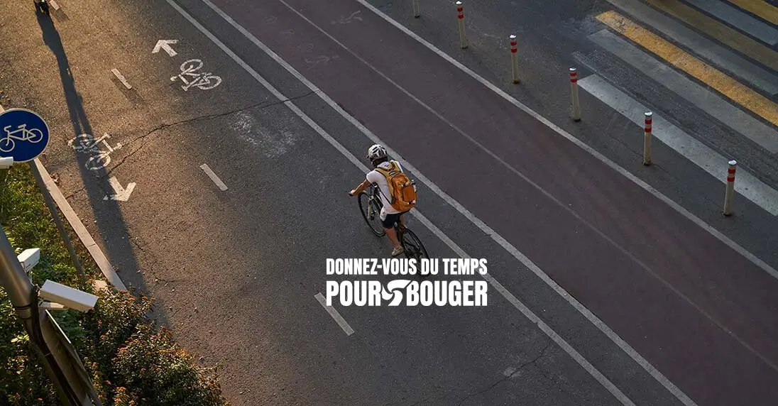 vue aérienne de nombreux cyclistes sur la route avec le logo donnez-vous du temps pour bouger et optimity